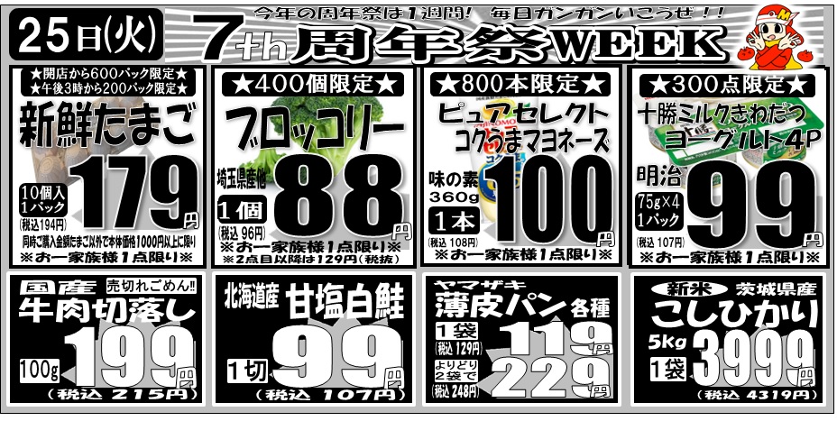 ★11.25(火)~11.28(金)は周年祭本番に向けての前哨戦「7th周年祭week」を開催!火曜日から金曜日まで全曜日に今話題の「県内最安値宣言」商品をご用意いたします!