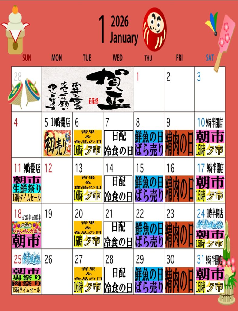 さあ令和7年1月のイベントカレンダーです♪1月5日(月)からは「新春初売り」!5日(月)と6日(火)は開店から先着100名様づつ、てんちょーから使い捨てカイロをプレゼント!寒い中いつも早朝から開店待ちで並んでいただいているお客様方へ気持ちばかりの御礼でございます(^-^) そして新年からは新企画!毎週火曜日は夕市を16時から、毎週土曜日は夕市を15時から開催いたします。それぞれ各部門からの厳選6品をタイムサービスします!2026年のマルサン桶川店は朝も夕方もお買い得!そして1.24(土)~1.26(月)は「冬の大感謝祭」と新年迎えても益々マルサン樋川店はお得で楽しいイベントが目白押しです!